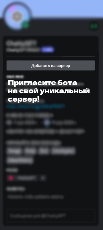 **Нажмите на профиль бота, и на кнопку "Добавить на сервер", далее согласитесь с правами, и авторизуйте бота на сервер!**\ <mark style="color:blue;">**Бот не требует прав Администратора, а лишь право отправлять сообщения и использовать Slash-команды.**</mark>